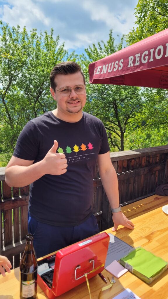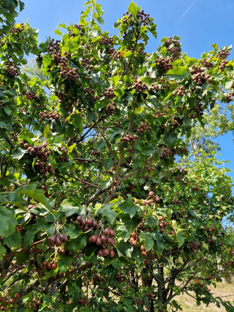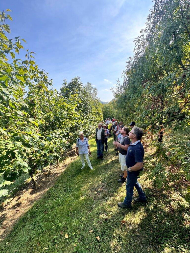 Wir wurden durch den Leiter der Anlage empfangen und neben der Elsbeere haben wir Einblicke in die Aufzucht von weiteren Obstsorten bekommen. Im Gegensatz zu Michelbach, wo heuer die Ernte nicht besonders stark ausfallen wird, sind die Elsbeerbäume am Haschhof mit Früchten behangen!