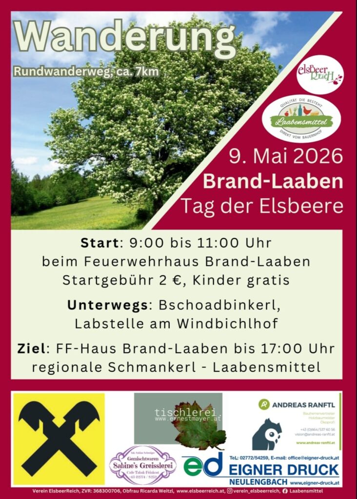 Tag der Elsbeere steht wieder vor der Tür! Diesmal sind wir in Brand-Laaben, erkunden neue Wege und freuen uns auf Schmankerl die vom Verein Laabensmittel vorbereitet werden. Die geplante Wanderung ist knapp 9 km lang, führt über sanfte Hügel von Laaben nach Pyrat und über Brand wieder hinunter in das Laabental. Für Abwechslung sorgt Wald, Streuobstwiesen, Schneebergblick, Wildgehege und Arche-Hof mit Pferden, Schafen, Schweinen und Hühnern. Etwa 10 Elsbeeren von klein bis groß warten um beobachtet zu werden. Gehzeit ca. 2 Stunden ohne Pausen. Für einen gemütlichen Spaziergang mit drei Kindern in Alter von 4 bis 7 Jahren haben wir knapp vier Stunden gebraucht. unten ein Paar Eindrücke aus unserer Erkundung am 11. April: